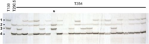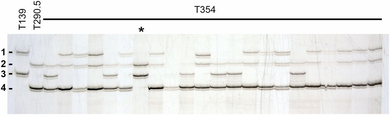 Fig. 3. Genotyping of triploid offspring. Triploid offspring are genotyped using polymorphic markers when both progenitors are heterozygous for different pairs of alleles (results for marker 033F11 are shown; see Table S1 for details). This type of marker allows identification of paternal (T139, heterozygous for alleles 1 and 3) and maternal (T290.5, heterozygous for alleles 2 and 4) contributions. Most triploid individuals (T354) will have three different alleles (one paternal and both maternal alleles), although triploids with two copies of one of the maternal alleles are also possible (*). The use of several markers differentiates diploids from triploids with two copies of the same allele.