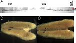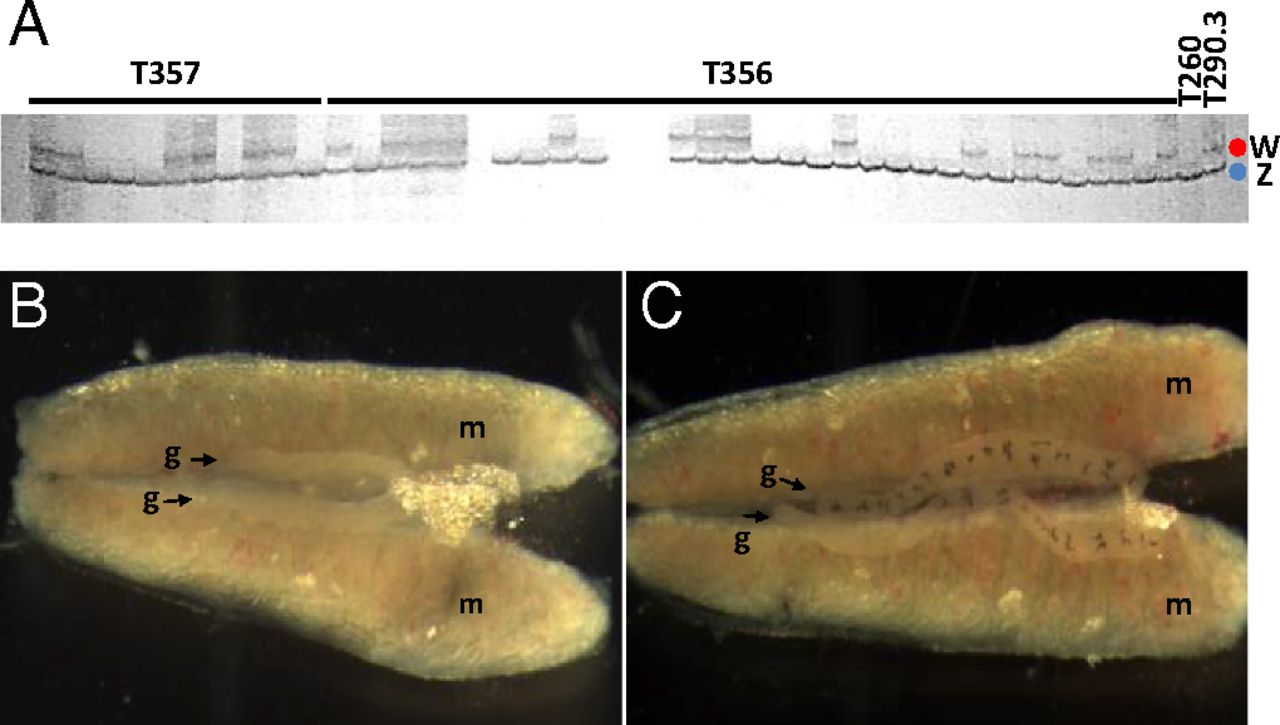 Fig. 1. Genotypic and phenotypic sex of X. tropicalis samples. (A) Genotypic sex of estrogen-treated animals (T356 and T357) was determined using several sex-linked SSLP markers with informative polymorphisms in their progenitors. The father of clutches T356 and T357 (T260) is homozygous for the SSLP marker shown in A; the mother (T290.3) is heterozygous, with the longer allele (red dot) located on the W chromosome and the shorter allele (blue dot) located on the Z chromosome (data obtained from grandparents). When this marker is used, ZW individuals have two bands, and ZZ individuals have only one. Sex-reversed males are identified as phenotypic females with a ZZ genotypic constitution for several informative sex-linked markers. (B and C) X. tropicalis gonads (g) attached to mesonephroi (m) from male (B) and female (C) tadpoles at stage NF 60. When the gonad has differentiated morphologically, the sex of tadpoles can be established by direct observation of the gonad under the stereoscope after dissection.