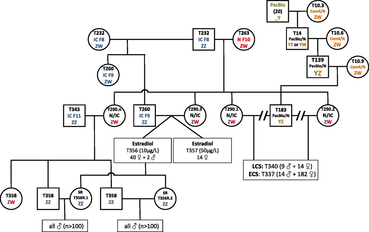 Fig. S2. Pedigree chart of the N/IC family used in estradiol sex-reversal and gynogenesis experiments. SR indicates sex-reversed individuals. Color coding refers to the strain the sex chromosomes come from: red, Nigerian; blue, Ivory Coast; Green, PacBio; orange, Cam4/N.