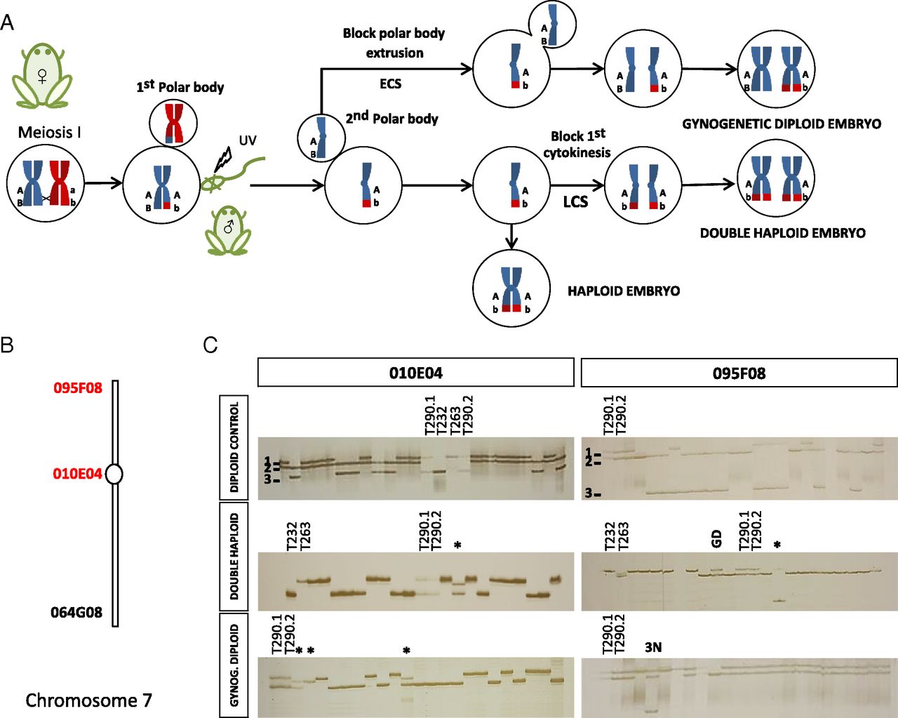 Fig. 2. Gynogenetic animals: production, confirmation of absence of paternal DNA, and verification of double haploids and gynogenetic diploids obtained by LCS and ECS, respectively. (A) To obtain gynogenetic offspring, the paternal contribution is blocked by UV-irradiation of sperm. Haploid (nonviable) embryos are rescued to viable diploidy either by suppressing second polar body formation with ECS to produce gynogenetic diploid embryos (heterozygous at many distal loci) or by blocking first cytokinesis using LCS and producing completely homozygous double haploids. (B) Chromosomal position of the two markers shown in C (red) on X. tropicalis chromosome 7 according to Wells et al. (36). (C) Genotypes for markers 010E04 (centromeric) and 095F08 (distal) in nongynogenetic diploid controls, double haploids, and gynogenetic diploids. A three-allele system for marker 010E04 allows the identification of the paternal contribution because the father is homozygous for allele 2, not present in the mothers (T290.1 and T290.2), heterozygous for alleles 1 and 3. Both triploid and nongynogenetic leaker individuals (labeled as 3n and *, respectively) were observed among true double haploids and gynogenetic diploids. The polymorphism for marker 095F08 (together with all markers included in Table 2) distinguishes true isogenic double haploids from gynogenetic diploids (GD) arising from spontaneous polar body failure. Double-haploid individuals are homozygous for all markers analyzed, whereas gynogenetic diploids are homozygous for centromeric markers, with a high probability of heterozygosity at distal loci.