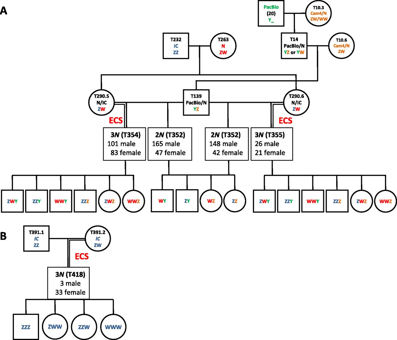 Fig. S3. Pedigrees and sex ratios of triploid and diploid siblings. (A) Pedigree and sex ratios of triploid and diploid siblings obtained from hybrid progenitors. The progenitors used in A were produced from interstrain crosses to obtain hybrids with high heterozygosity. The strain/stock of origin and proposed sex chromosome constitution are indicated (color-coded according to the strain/stock they come from; red: Nigerian; blue: Ivory Coast; green: PacBio; orange: Cam4/N hybrids). (B) Pedigree and sex ratios for triploids obtained from IC progenitors. The proposed sex chromosome constitutions are stated.