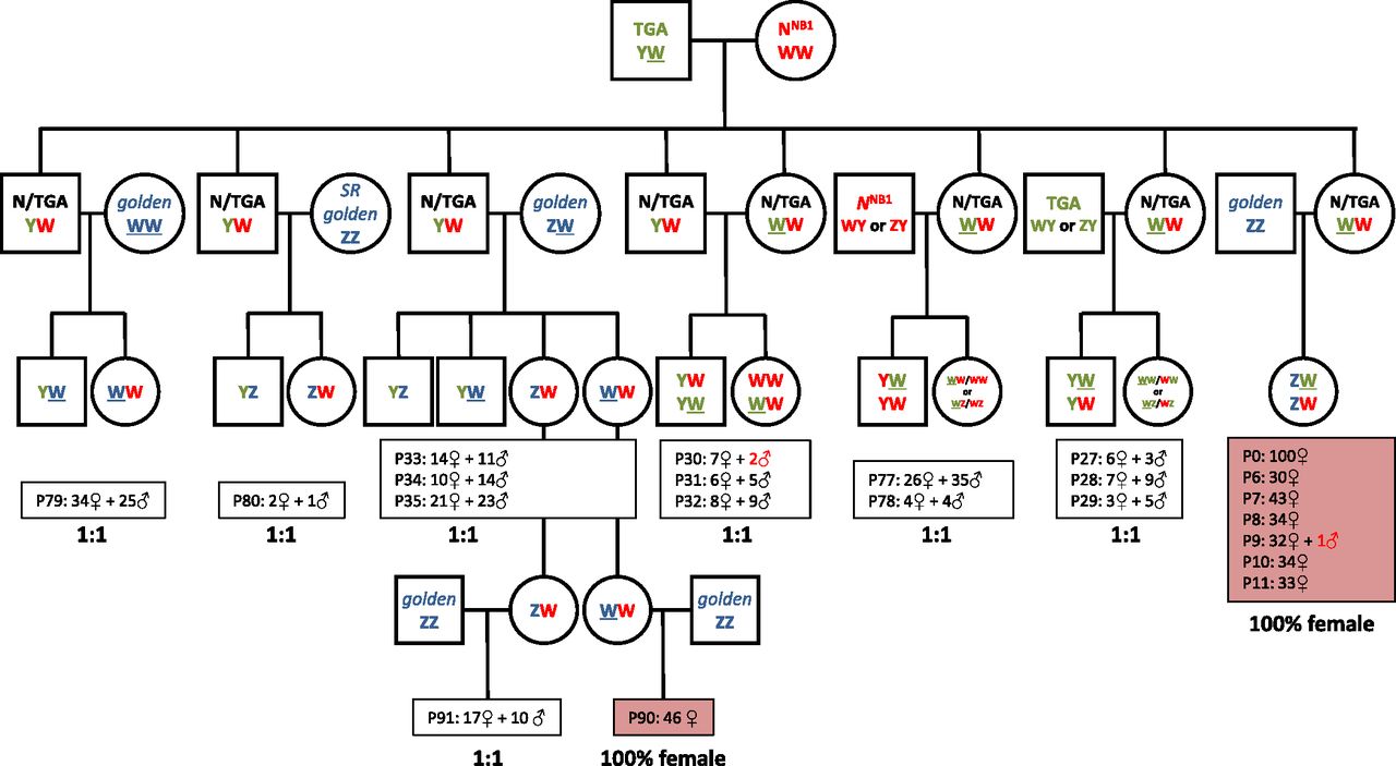 Fig. 4. Sex ratios and sex-linked marker inheritance in interstrain pairings prove the existence of Y, W, and Z sex chromosomes. The pedigree chart of the interstrain pairings performed shows the sex of the offspring obtained in different spawns (P0 to P91). All-female offspring were observed in two types of crosses (labeled in red), both involving golden ZZ males (obtained from breeding sex-reversed ZZ females with ZZ males). These offspring are possible only if the mothers are WW. Without sex reversal or gynogenesis, WW females can be produced only if males with a W chromosome (YW) are bred with ZW or WW females. Because all hybrid N/TGA females analyzed were WW, the sex chromosome constitution of the progenitors used to produce these hybrids was YW (TGA male) and WW (NNB1 female). Other TGA and NNB1 males used in this pedigree have a Y chromosome, although the data do not distinguish YZ from YW. The proposed sex chromosome constitution for all the animals in the pedigree chart is depicted together with a color code that indicates the strain or provenance (green: TGA; red: Nigerian; blue: golden). SR indicates a sex-reversed individual obtained by ethynylestradiol exposure (see pedigree chart in Fig. S1).