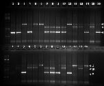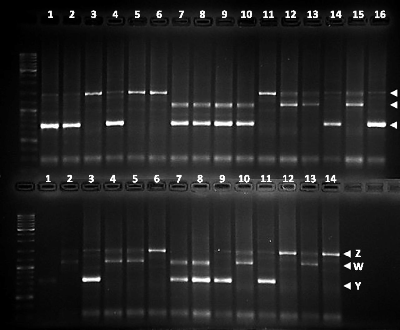 Fig. S4. Sex-linked marker in the offspring of cross X29. The genotype for a sex-linked marker is shown for the parents and offspring of cross X29. The father (M.Po1) is heterozygous for the alleles labeled as Z and Y (sample number 16 in upper row). The mother (T290.7) is heterozygous for alleles Z and W (sample number 15 in upper row). Phenotypic males are YZ (A: 1, 2, 4, 14, 15; B: 1, 3, 11), YW (A: 7, 8, 9, 10; B: 7, 8), or ZZ (A: 3, 5, 6, 11; B: 6, 12, 14). Phenotypic females can be only ZW (A: 12, 13, 15; B: 2, 4, 5, 10 and 13). A: upper row; B: lower row.