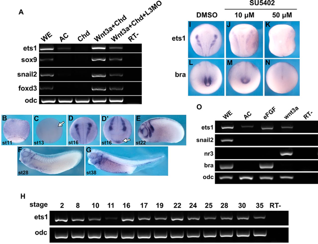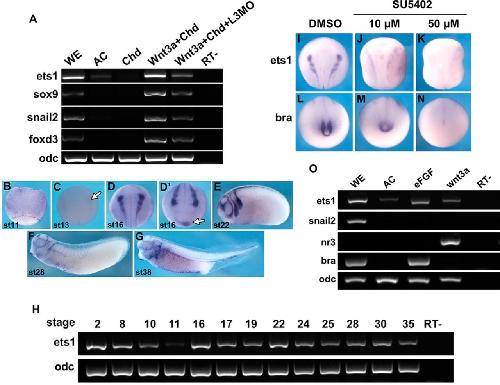 FIGURE 1. Expression of ets1 in NC is regulated by Lrig3 and FGF signaling. A, embryos were injected with chordin (Chd), chordin + wnt3a, or chordin + wnt3a + lrig3MO (L3MO). Animal caps were dissected at stage 9 and cultured to stage 17. Expression of the indicated genes in animal caps was assayed by RT-PCR. Ornithine decarboxylase (odc) was used as an internal standard. WE, uninjected whole embryo; AC, uninjected animal caps; RTâ, without reverse transcriptase. BâG, spatial expression pattern of ets1 as detected by in situ hybridization. B, C, and D, dorsal view; Dâ², anterior view; E, F, and G, lateral view. The white arrow in C indicates the weak ets1 signal starting at stage 13. The ventral blood island is indicated by a white arrow in Dâ². H, temporal expression of Xenopus ets1a at the indicated stages. IâN, embryos treated with the indicated concentrations of SU5402 from stage 12. ets1 and brachyury (bra) expression was examined at stage 16 by whole-mount in situ hybridization. The expression of the indicated genes was affected in the following percentage of embryos: M, 73% (8 of 11); N, 100% (20 of 20); J, 33% (7 of 21); K, 61% (11 of 18). O, embryos were injected with 10 pg of efgf or 300 pg of wnt3a mRNA, respectively. The caps were dissected from embryos at stage 9 and then cultured to stage 15. Expression of the indicated genes in animal caps was assayed by RT-PCR. |