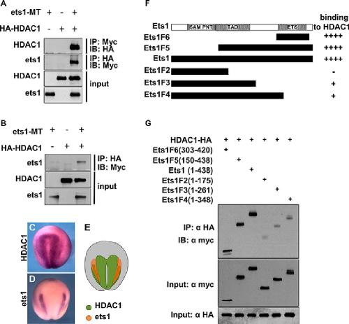 FIGURE 6. Ets1 physically interacts with HDAC1 through the ETS domain. A, co-IP was carried out with extracts of HEK293T cells transfected with either Ets1-Myc, HDAC1-HA separately, or both using antibodies against Myc or HA. B, co-IP indicates that Ets1-Myc binds to HDAC1-HA in Xenopus embryos. CâE, expression patterns of Xenopus hdac1 (C) and ets1 (D) in Xenopus embryo at stage 17. A schematic diagram of Xenopus hdac1 and ets1 expression (E) indicates overlap between them. F, Ets1 deletion mutants and their binding ability to HDAC1. G, co-IP was carried out to examine the binding of Myc-tagged Ets1 deletion mutants and HDAC1-HA in HEK293T cells. IB, immunoblot; TAD, transactivation domain; SAM, sterile α motif; PNT, pointed. |