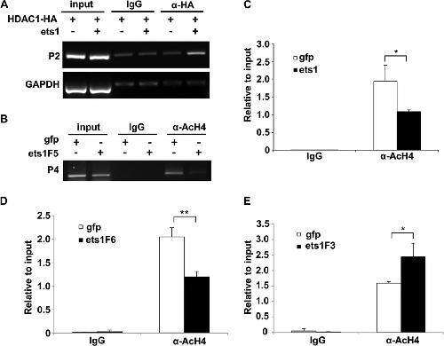 FIGURE 8. Ets1 recruits HDAC1 to the id3 promoter and reduces the level of acetylated histone 4. A, ChIP was done using HEK293T cells transfected with either HDAC1-HA alone or Xenopus Ets1. The precipitated DNA fragments were amplified using primer pair 2 (P2) or the GAPDH primer pair. The co-expression of Ets1 promoted the binding of HDAC1 to the ID3 promoter. BâE, ChIP was performed in the embryos injected with the indicated mRNAs. The precipitated DNA fragments were analyzed by semiquantitative PCR (B) or real time PCR (CâE). Error bars represent S.D. Asterisk represents p value <0.05 and double-asterisk represents p value <0.01. |