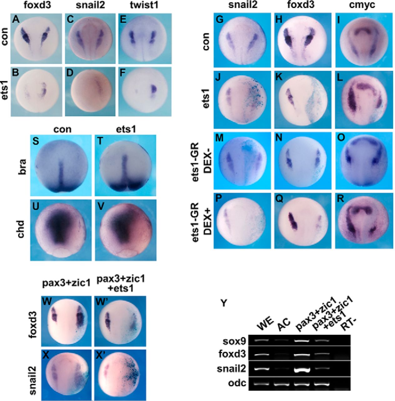 FIGURE 4. Overexpression of ets1 represses formation of NC in embryos and in animal caps injected with pax3 and zic1 mRNAs. AâF, the NC markers foxd3 (100%, 10 of 10), snail2 (78%, 7 of 9), and twist1 (80%, 12 of 15) were repressed by overexpression of ets1. GâR, either ets1 or ets1-GR mRNA was co-injected with lacZ mRNA into one dorsal blastomere of four-cell embryos, and embryos were collected at around stage 17. Embryos injected with ets1-GR were treated with dimethyl sulfoxide or DEX from stage 12 to stage 17. Whole-mount in situ hybridization was used to examine the NC marker genes snail2 (J, 71%, 17 of 24; M, 100%, 19 of 19; P, 65%, 13 of 20), foxd3 (K, 63%, 17 of 27; N, 95%, 18 of 19; Q, 62%, 8 of 13), and c-myc (L, 62%, 13 of 21; O, 100%, 20 of 20; R, 60%, 9 of 15). The injected side was traced by LacZ staining. SâV, mesoderm marker genes brachyury (bra; S and T) and chordin (chd; U and V) were examined in embryos injected with ets1. S and U, control embryo; T and V, ets1-injected embryos. WâXâ², the mRNA mixtures of pax3 + zic1 or pax3 + zic1 + ets1 were injected into one dorsal blastomere at the four-cell stage, and the expression of foxd3 (W, 90%, 17 of 19; Wâ², 74%, 29 of 39) and snail2 (X, 94%, 15 of 16; Xâ², 75%, 24 of 32) was examined by whole-mount in situ hybridization at stage 16. Y, animal cap assays indicated that overexpression of ets1 suppressed the expression of NC maker genes induced by pax3 and zic1 and enhanced neural marker genes. WE, uninjected whole embryo; AC, uninjected animal caps; RTâ, without reverse transcriptase; con, control. |