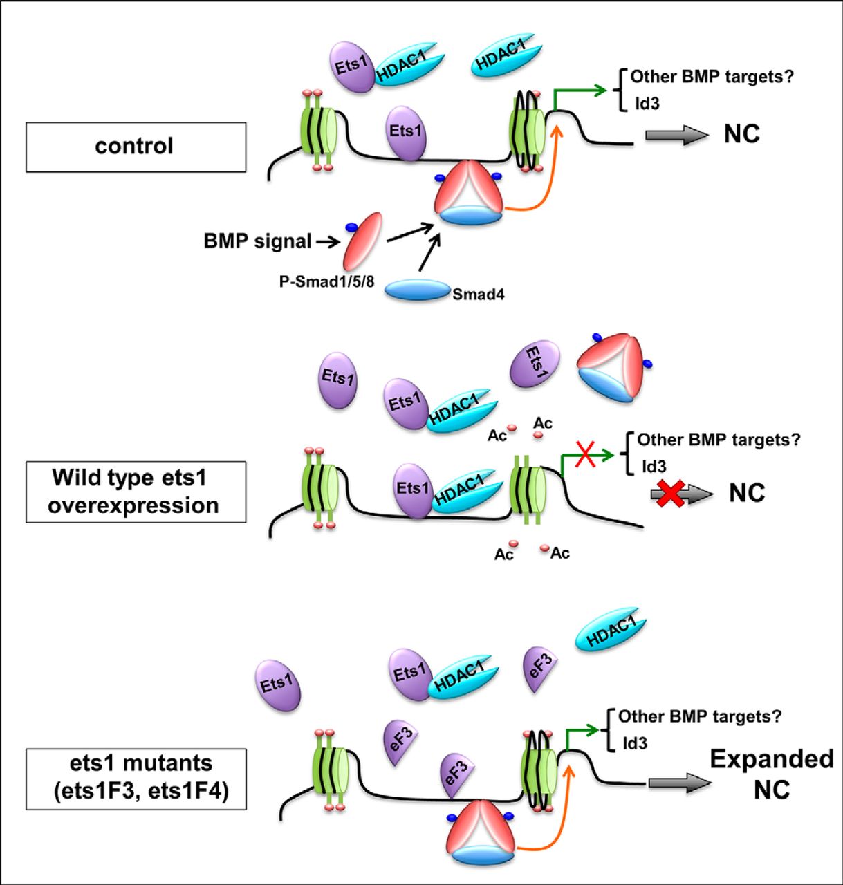 FIGURE 9. Proposed model showing Ets1 regulation of BMP signal and NC formation through Hdac1. When ets1 is overexpressed in embryos, it binds to Hdac1, and recruits Hdac1 to the id3 promoter, leading to deacetylation of histone and chromatin condensation, which prevents transcription of id3 and causes inhibition of NC formation. Other BMP targets involved in NC development may also be affected by this mechanism. When ets1F3 or ets1F4 Ets1 mutant is overexpressed, it enhances histone acetylation of id3 promoter and therefore promotes NC formation. eF3, Ets1F3; Ac, acetyl group; P-Smad, phosphorylated Smad. |