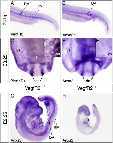Fig 3. Expression of Anxa3 in the endothelial lineage is conserved across multiple species.(A,B) Whole-mount in situ hybridization analysis for vascular endothelial growth factor receptor 2 (VegfR2) and Anxa3b expression in Danio rerio embryos, 24 hours post fertilization (hpf). Close-up, lateral views of the tail regions are shown. Anxa3b transcripts are restricted to the developing dorsal aorta (DA), whereas VegfR2 is also expressed in the intersomitic vessels (isv). (C-F) Embryonic (E) day 8.25 mouse embryos were assayed for Anxa3 and the vascular marker PlexinD1 by whole-mount in situ hybridization (anterior views). Similar to PlexinD1, Anxa3 is observed in the paired dorsal aortae (da, arrows) and heart (h) region of the embryo. Anxa3 is absent in the extra-embryonic vessels of the yolk sac (ys) that are marked by PlexinD1 expression. This is highlighted in close-up views of ys from PlexinD1 and Anxa3 stained E8.25 embryos (D,F). (G,H) E9.25 heterozygous (+/-) and homozygous (-/-) VegfR2 embryos analyzed for Anxa3 expression by in situ hybridization (lateral views). Anxa3 is detected in the dorsal aorta (DA), intersomitic vessels (isv) and heart (h) region of VegfR2+/- embryos, while VegfR2-/- null embryos, which lack all blood vessels, displayed no observable vascular staining of Anxa3 (background staining is detected in the head and just outside the heart region).