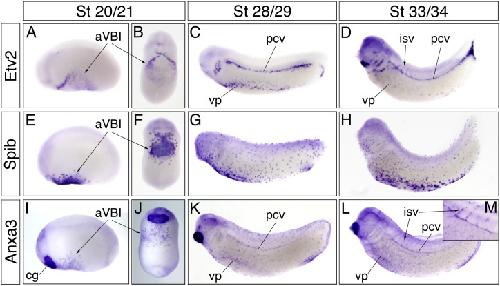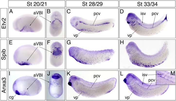 Fig 1. Anxa3 is expressed in endothelial and myeloid cells of developing Xenopus laevis embryos.Whole-mount in situ hybridization analysis of Etv2, SpiB and Anxa3 transcripts in Xenopus embryos at stages (St) 20/21, 28/29 and 33/34 (A-M). Lateral (A,C,D,E,G,H,I,K,L) and ventral (B,F,J) views show a close association of Anxa3 with the developing endothelial (Etv2) and myeloid (SpiB) lineages. At early stages (I,J), Anxa3 is expressed in the anterior ventral blood island (aVBI), which consists of adjacent Etv2 (A,B) and SpiB (E,F) expressing cells. At St 28/29 and 33/34, Anxa3 (K,L) is detected in the major vascular structures highlighted by Etv2 expression (C,D): the posterior cardinal vein (pcv), vascular plexus flank (vp) and intersomitic vessels (isv). (M) High magnification view of an embryo showing strong expression of Anxa3 in the pcv and isv. Anxa3 is also observed in the myeloid cells (marked by SpiB) that migrate throughout the entire embryo (compare the G,H to K,L). Throughout development, Anxa3 is also present in the cement gland (cg).