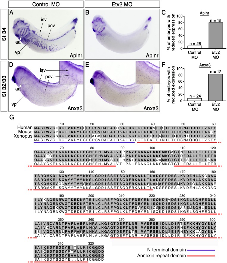 Fig 2. Anxa3 is expressed in Etv2-dependent endothelium.Analysis of Aplnr and Anxa3 expression in embryos injected with 25 ng of control (A,D) and Etv2 (B,E) MOs (stage 32â34, lateral views). (A,B) Etv2 MO blocks expression of the vascular marker Aplnr, as compared to control MO treated embryos. (C) Graphical representation of the percentage of control and Etv2 MO injected embryos showing reduced vascular expression of Aplnr. (D,E) Vascular expression of Anxa3 is lost in Etv2 MO injected embryos but retained in control MO injected embryos. Insets are higher magnification views centered on the developing posterior cardinal vein (pcv) and intersomitic vessels (isv). Notice that Anxa3 transcripts are present in myeloid cells in both control and Etv2 morphants. (F) Graphical representation of the percentage of control and Etv2 MO injected embryos showing reduced vascular expression of Anxa3. aa, aortic arches (white arrowhead); vp, flank vascular plexus. (G) Amino acid sequence alignment of human, mouse, Xenopus ANXA3 and zebrafish ANXA3(a) and ANXA3(b) proteins (MacVectorâdark shading indicates identity and light shading indicates similarity of amino acids). The N-terminal domain is underlined in blue and the Annexin repeat domains (4) are underlined in red.