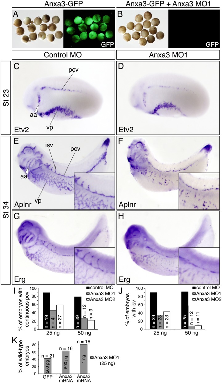 Fig 5. Anxa3 MO treated embryos fail to undergo proper blood vessel morphogenesis.(A,B) Anxa3 MOs efficiently block translation of a control transcript consisting of the Anxa3 5’UTR fused to the coding region of green fluorescent protein (GFP). Injection of this mRNA results in GFP expression in the embryo, however co-injection with Anxa3 MO blocks GFP translation. (C-H) Whole-mount in situ hybridization analysis (lateral views) on control MO and Anxa3 MO1 (25 ng) injected embryos. (C,D) At stage (St) 23, control and Anxa3 MO treated embryos show grossly similar expression levels of the EC differentiation marker Etv2. (E-H) At St 34, major vascular defects were visualized by in situ hybridization for Aplnr and Erg expression. Anxa3 morphants display non-continuous vessels and rarely form intersomitic vessels (isv) or aortic arches (aa). Insets show high magnification views of the posterior cardinal vein (pcv) and isv region. Notice in some cases (F), ECs appear unattached but aligned in the proper location. (I, J) Categorization of two non-overlapping Anxa3 MO (MO1 and 2) phenotypes compared to control MO treated embryos (St 34). Embryos injected with either non-overlapping Anxa3 MO seldom form isv and continuous, organized pcv. n, number of embryos assayed. (M) Anxa3 MO1-induced phenotypes (discontinuous pcv, unorganized vp and loss of isv and aa), as assessed by in situ hybridization for Aplnr transcripts (S2 Fig) and presented in graphical form, can be rescued in a dose dependent manner by co-injection of Anxa3 mRNAs.
