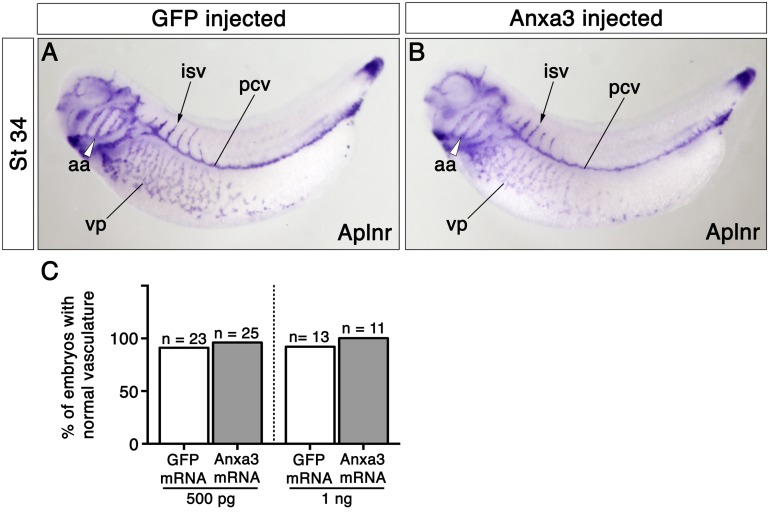 Fig 6. Anxa3 gain-of-function has no effect on developing blood vessels in vivo.(A,B) Whole-mount in situ hybridization for Aplnr expression in GFP and Anxa3 mRNA injected embryos (stage 34, lateral views). No changes in overall vessel morphology or levels of Aplnr expression were observed. (C) The percent (%) of GFP and Anxa3 mRNA injected embryos displaying normal vascular formation, as assessed by Aplnr expression, are shown. Aortic arches, aa; intersomitic vessel, isv; n, number of embryos assayed; posterior cardinal vein, pcv and vascular plexus, vp.