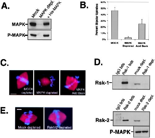 Figure 2. MAP kinase, not Rsk, is required for spindle assembly in Xenopus egg extracts. (A) Immunoblot analysis of endogenous MAP kinase protein and activity (p-MAPK antibody). (B) The efficiency of spindle assembly. 500 spindle structures were counted per sample. The data represent the average ± SEM obtained from three independent experiments. (C) Representative spindle structures. Bar, 10 μm. (D) immunoblots of Rsk1 and Rsk2. (E) Metaphase spindles assembled in mock- and Rsk1/2-depleted extracts. Bar, 10 μm. From three independent experiments the efficiency of spindle formation was ∼50% in mock- and Rsk1/2-depleted extracts (>100 spindle structures assessed per extract). Note: no statistical difference in microtubule density, spindle length, and spindle width was found between spindles formed in mock- or Rsk-depleted extracts (unpublished data).