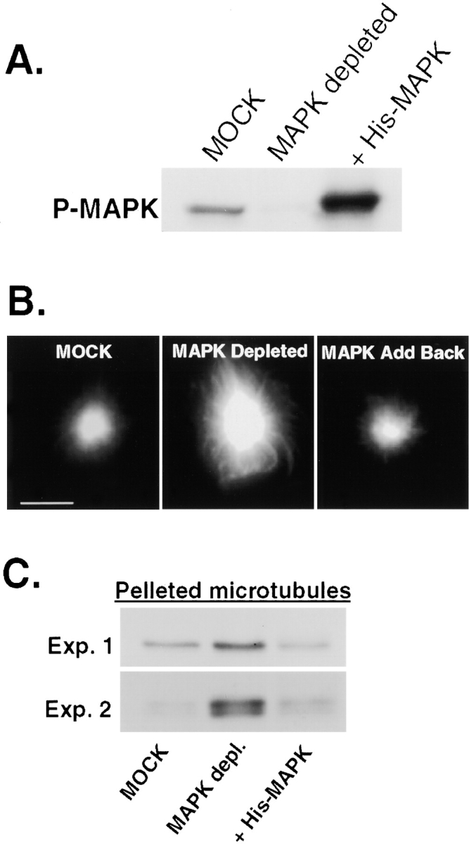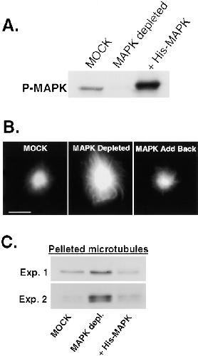 Figure 3. Depletion MAP kinase in Xenopus M phase egg extracts leads to an increase in the length and polymerization of microtubules. (A) Immunoblot of phospho-MAP kinase. Reprobing the blot for MAP kinase protein shows similar results. (B) Typical microtubule asters. Bar, 10 μM. (C) Immunoblots of α-tubulin for two independent experiments representing the relative abundance of polymerized microtubules in mock, MAP kinase–depleted, and MAP kinase add-back extracts. A two- to sixfold increase in total polymerized tubulin was measured in MAP kinase–depleted extracts.