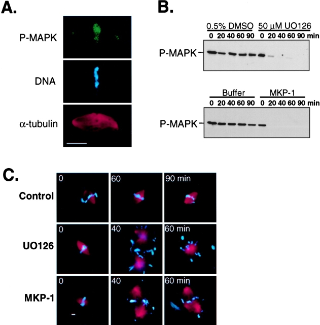 Figure 4. Spindle stability requires persistent MAP kinase activation in Xenopus mitotic extracts. Bipolar spindles were assembled in Xenopus egg extracts cycled into mitosis with nondegradable cyclin B. At time 0, extracts were either processed for immunofluorescence with phospho–MAP kinase antibodies (A), or treated with the MEK inhibitor U0126 (50 μM final) or recombinant Xenopus GST-MKP-1 (40 ng/μl final). (B) Immunoblot analysis of active-MAP kinase at indicated time points. (C) Typical spindle or aster-like structures observed by epifluorescence at selected times following treatments. 100 spindle structures monitored for each sample per time point. Bar, 10 μm.