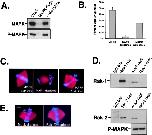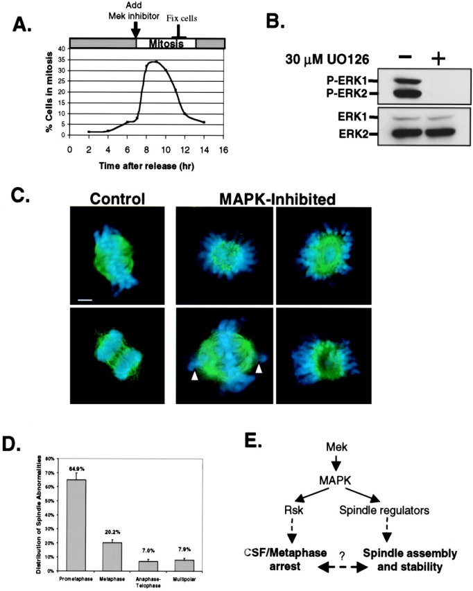 Figure 5. Inhibition of MAP kinase in NIH 3T3 cells leads to aberrant spindles. (A) Time course of mitotic index and experimental scheme. Cells collected for immunoblot analysis of active-ERK and total ERK protein (B) or fixed with 4% paraformaldehyde (C) and stained with α-tubulin antibodies and DAPI to visualize spindle microtubules (green) and chromosomes (blue), respectively. (Left) Control-treated cells in metaphase and late anaphase. (Right photos) Abnormal spindles observed in MAP kinase–inhibited cells at mitosis (typical from ten independent experiments). White arrows show unattached chromosomes. Images were collected using a 100X oil objective lens. Bar, 2 μm. (D) Quantitation of abnormal spindle phenotypes in U0126 treated NIH 3T3 cells. The data represent the average ± standard deviation of three independent experiments where 120 abnormal mitotic figures were analyzed for each experiment. (E) Proposed model for MAP kinase pathway in spindle regulation.