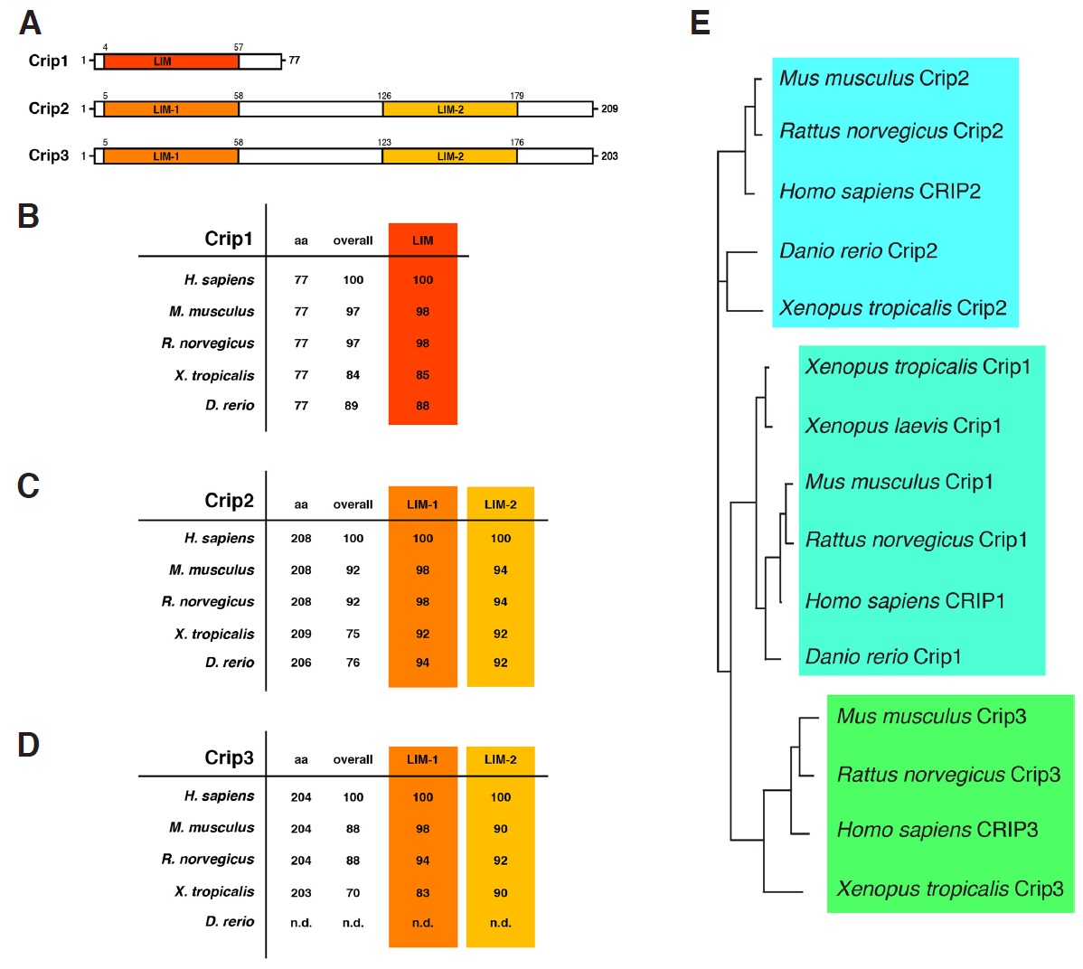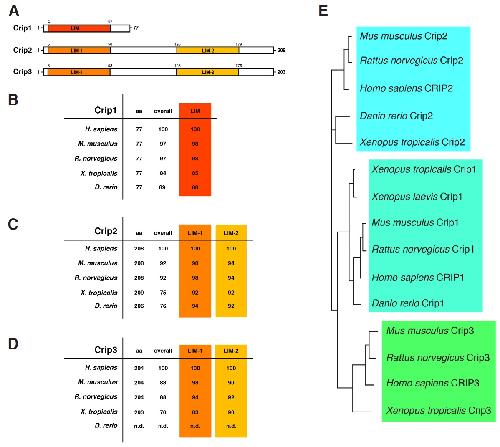 Fig. 1. Crip1, Crip2 and Crip3 in Xenopus. (A) Schematic representation of X. tropicalis Crip1, Crip2 and Crip3 protein domains. Crip1 contains one LIM domain, while Crip2 and Crip3 have two (LIM-1 and -2) each. (B-D) Homology of the amino acid sequences of the full length (overall) and individual LIM domains of the Crip proteins among different species. Numbers represent similarities of the indicated species in percentage compared to Homo sapiens. (E) Phylogenetic tree for the Crip sequences whose primary amino acid sequence alignment is shown in (A). aa, amino acid length in numbers; CRIP, cysteine-rich intestinal protein; LIM, Lin11, Isl-1 and Mec-3.
