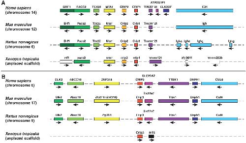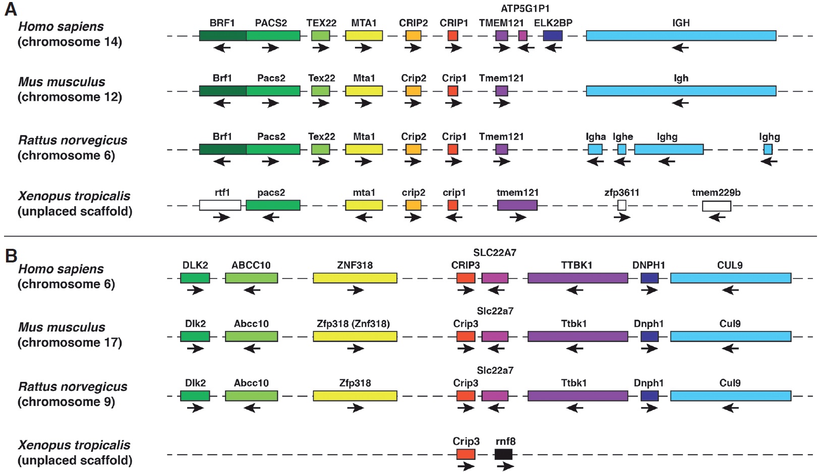 Fig. 2. Synteny analyses of the crip family members in Homo sapiens, Mus musculus, Rattus norvegicus, Xenopus tropicalis and Danio rerio. (A) The schematic overview shows the comparison of the crip1 and crip2 genes and their neighbouring gene loci in H. sapiens (chromosome 14), M. musculus (chromosome 12), R. norvegicus (chromosome 6) and X. tropicalis (unplaced scaffold). (B) The schematic overview shows the comparison of the crip3 gene and its neighbouring gene loci in H. sapiens (chromosome 6), M. musculus (chromosome 17), R. norvegicus (chromosome 9) and X. tropicalis (unplaced scaffold). The gene length and distances between them are not drawn to scale. Conserved genes are indicated by the same color code and non-conserved genes by white boxes. The orientation of the genes open reading frames are depicted by black arrows. Abcc10 ATP-binding cassette sub-family C (CFTR/MRP) member 10, asxl2 additional sex combs like 2 (Drosophila), ATP5G1P1 ATP synthase, H+ transporting, mitochondrial Fo complex, subunit C1 (subunit 9) pseudogene 1, BRF1 BRF1 RNA polymerase III transcription initiation factor 90 kDa subunit, CUL9 cullin 9, DLK2 delta-like 2 homolog (Drosophila), DNPH1 2â-deoxynucleoside 5â-phosphate N-hydrolase 1, dtnbb dystrobrevin beta b, ELK2BP ELK2B member of ETS oncogene family pseudogene, hadhab hydroxyacyl-CoA dehydrogenase/3-ketoacyl-CoA thiolase/enoyl-CoA hydratase (trifunctional protein) alpha subunit b, IGH immunoglobulin heavy locus/immunoglobulin heavy chain complex, Igha immunoglobulin heavy chain alpha, Ighe immunoglobulin heavy chain (epsilon polypeptide), Ighg immunoglobulin heavy chain (gamma polypeptide), kif3cb kinesin family member 3Cb, mta1 metastasis associated 1, pacs2 phosphofurin acidic cluster sorting protein 2, ptgr2 prostaglandin reductase 2, rnf8 ring finger protein 8, E3 ubiquitin protein ligase, rtf1 Rtf1 Paf1/RNA polymerase II complex component homolog, SLC22A7 solute carrier family 22 (organic anion transporter) member 7, slc25a21 solute carrier family 25 (mitochondrial oxodicarboxylate carrier) member 21, slc30a1b solute carrier family 30 (zinc transporter) member 1b, TEX22 testis expressed 22, tmem121 transmembrane protein 121, tmem229b transmembrane protein 229B, tmem62 transmembrane protein 62, TTBK1 tau tubulin kinase 1, zfp36l1a zinc finger protein 36 C3H type-like 1a, ZNF318/Zfp318 zinc finger protein 318.