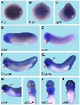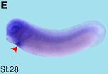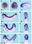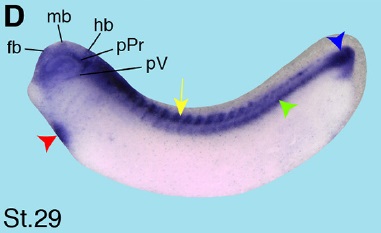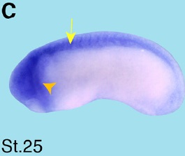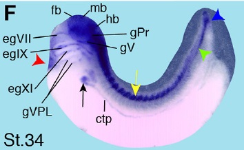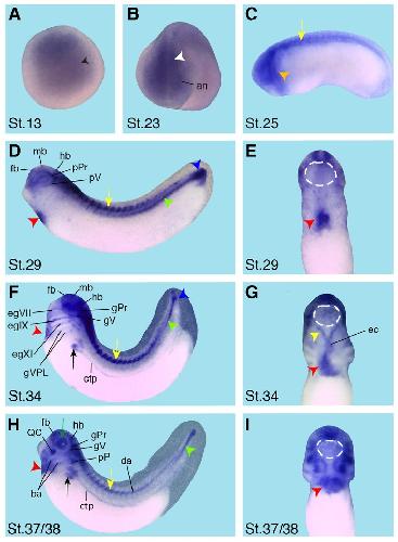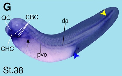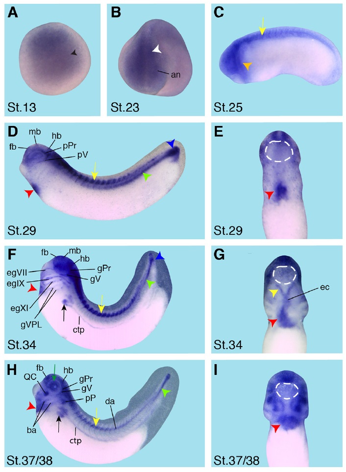 Fig. 6 (Left). Spatial expression pattern of crip2 during X. laevis embryonic development. Embryonic stages are indicated in each panel. The cement gland is depicted as white dashed circles. (A) Animal view of a stage 13 embryo. Crip2 expression was detected in the anterior neural plate (black arrowhead). (B) The anterior view of a stage 23 embryo showed a crip2 expression in the anterior neural tissue (an) and the neural tube (white arrowhead). (C-D,F,H) Lateral views with anterior to the left. (E,G,I) Ventral views with anterior to the top. (C) At stage 25 crip2 transcripts were detected in the migrating cranial neural crest cells (orange arrowhead) and the dorsal side of the embryo (yellow arrow). (D-I) Crip2 was expressed in the cardiac tissue especially of the first heart field (red arrowheads), the endocardium (ec) and the cardiac vascular nerves (yellow arrowhead). (D) At stage 29 crip2 transcripts were strongly detected at the dorsal side (yellow arrow), the posterior cardinal vein (green arrowhead) and at the tip of the tail (blue arrowhead). Furthermore, crip2 was expressed in the fore-, mid- and hindbrain (fb, mb, hb) as well as in the profundal placode (pPr) and the trigeminal placode (pV). (F,H) Later during organogenesis crip2 transcripts were additionally detected in the anterior part of pronephros (black arrow) and the connecting tubule of the pronephros (ctp). (F) At stage 34 the profundal ganglion (gPr), the trigeminal ganglion (gV), the facial epibranchial ganglia egVII, egIX and egXI and the cells that contribute to the vagal and posterior lateral line ganglion (gVPL) were positive for crip2. (H) At stage 37/38 crip2 was also expressed the quadrate cartilages (QC), branchial arches (ba) and dorsal aorta (da).