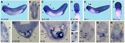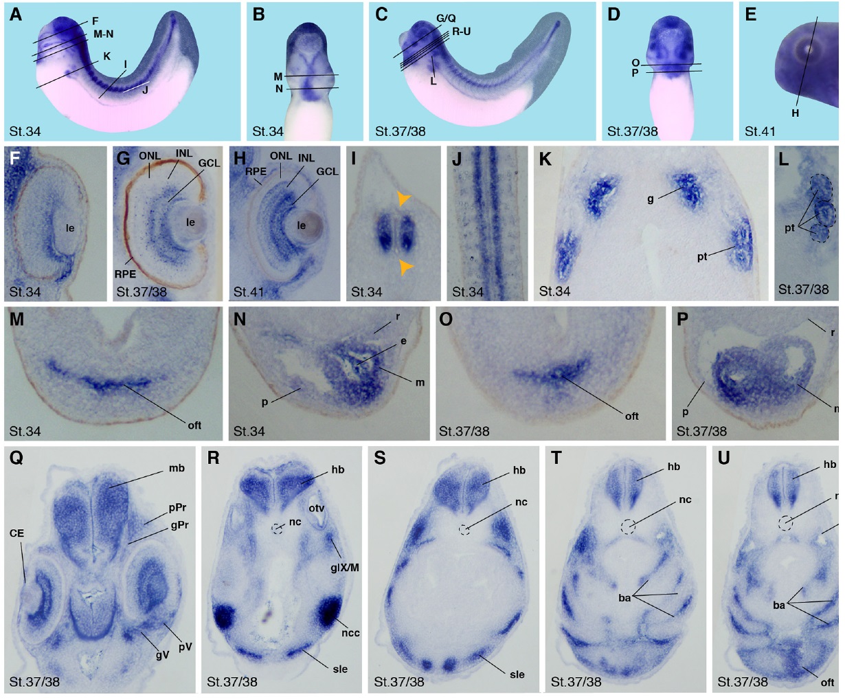 Fig. 7 (Bottom). Crip2 tissue specific expression in Xenopus embryos stage 34, 37/38 and 41. (A,C,E) Lateral views with anterior to the left. (B,D) Ventral views with anterior to the top. Black lines show level of sections demonstrated in F-U. (F-I,K,M-U) Transversal sections with the dorsal side to the top. (J, L) Horizontal sections with anterior to the top. The notochord (nc) and pronephric tubules (pt) are depicted by dashed circles, respectively (L,R-U). (F-H) During Xenopus embryogenesis crip2 was expressed in the developing eye, more precisely the ganglion cell layer (GCL). In contrast, no expression was detected in the lens (le), the inner and outer nuclear layer (INL, ONL) or the retinal pigmented epithelium (RPE). (I,J) At stage 34 crip2 was found in the neural tube except at the most dorsal and ventral parts (orange arrowheads). (K,L) Furthermore, crip2 expression was detected in the glomerulus (g) and the specific pronephric tubules (pt). (M-P) Cardiac sections at stage 34 and 37/38 revealed crip2 expression in the outflow tract (oft), the pericardial roof (r) as well as the myo- and endocardium (m, e) of the developing heart, but not the pericardium (p). (Q-U) Crip2 was expressed in various tissue of the brain, predominantly in the mid- and hindbrain (mb, hb). The ganglia and placodes of the profundal (gPr, pPr) and trigeminus (gV, pV) show distinct crip2 expression as well as the cornea epithelium (CE) (Q). (R-I) Consecutive transversal sections at the level of the otic vesicle (otv) showed crip2 transcripts in the sensory layer of epidermis (sle), neural crest cells (ncc), the fused ganglia of the glossopharyngeal and middle lateral line nerves (glX/M) and the branchial arches (ba).