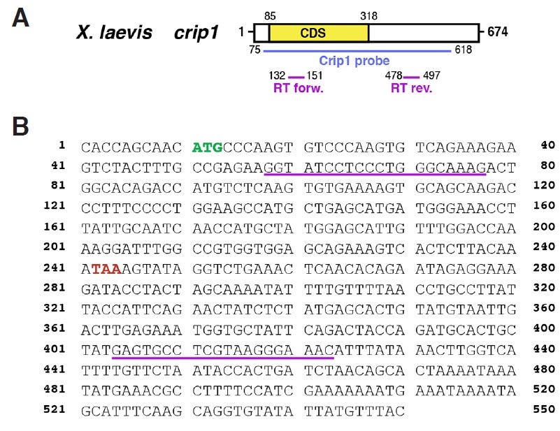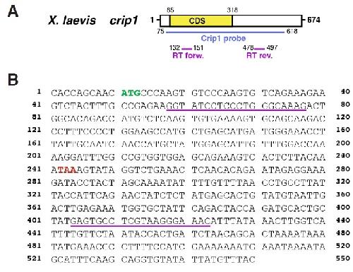 Suppl. Fig. S1 (Left). (A) Schematic overview of Xenopus laevis crip1 published by others (Acc. No. NM_001093834.1). cDNA fragment of crip1 cloned in this study (Acc. No. KP036486), which was used as template for an antisense probe is highlighted in blue and localization of RT-PCR primers used in Figure 3 in pink. (B) Nucleotide sequence of Xenopus laevis crip1 cDNA and RT-PCR primer pairs (underlined in pink). Note that crip1 primers were designed using the previously published Xenopus laevis sequence (Acc. No. NM_001093834.1) and therefore do not completely match with the sequence shown here. The ATG start codon is highlighted in green, the stop codon in red.