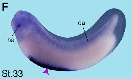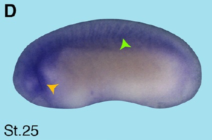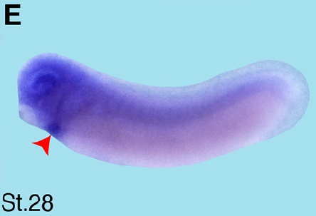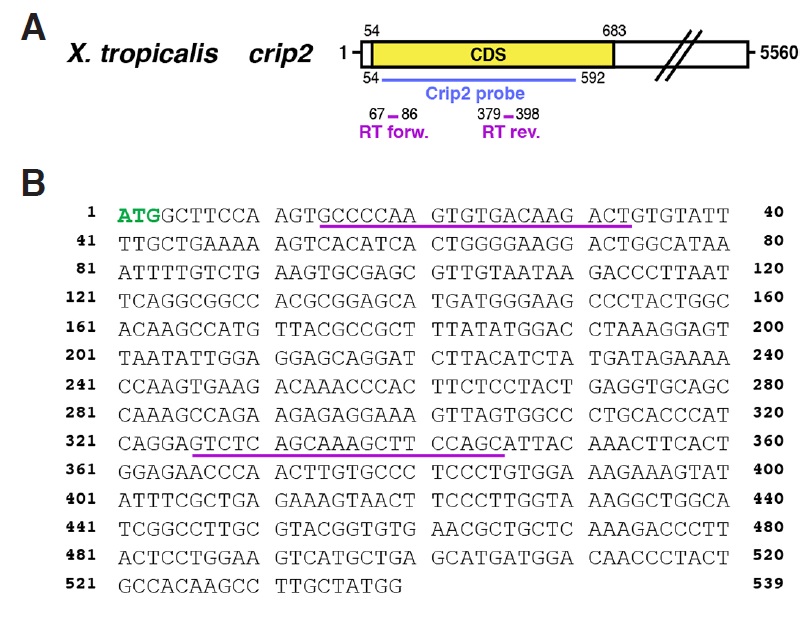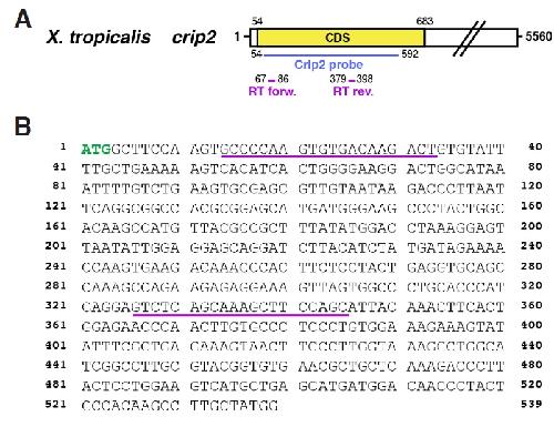 Suppl. Fig. S2 (Right). (A) Schematic overview of Xenopus tropicalis crip2 published by others (Acc. No. NM_001079267.1). Xenopus laevis cDNA fragment of crip2 cloned in this study (Acc. No. KP036487), which was used as template for an antisense probe is highlighted in blue and localization of RT-PCR primers used in Figure 3 in pink. (B) Nucleotide sequence of Xenopus laevis crip2 cDNA and RT-PCR primer pairs (underlined in pink). The ATG start codon is highlighted in green.