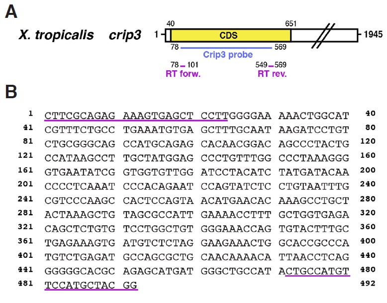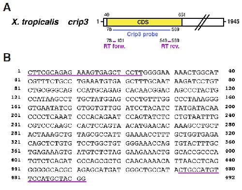 Suppl. Fig. 3 (Left). (A) Schematic overview of Xenopus tropicalis crip3 published by others (Acc. No. NM_001015811.1). Xenopus laevis cDNA fragment of crip3 cloned in this study (Acc. No. KP036488), which was used as template for an antisense probe is highlighted in blue and localization of RT-PCR primers used in Figure 3 in pink. (B) Nucleotide sequence of Xenopus laevis crip3 cDNA and RT-PCR primer pairs (underlined in pink).