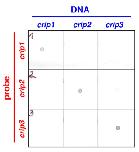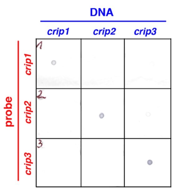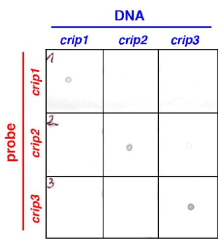 Suppl. Fig. 4 (Right). Dot blot analysis using Xenopus laevis crip1-3 plasmids (blue) shows the specificity of crip1-3 RNA probes (red).