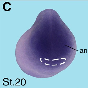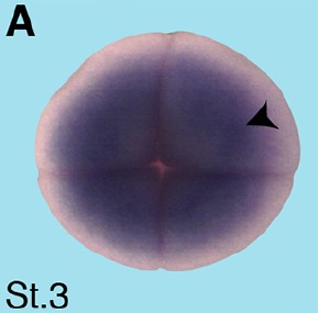 crip3 (cysteine-rich protein 3) gene expression in Xenopus laevis embryo, assayed via in situ hybridization, NF stage 3, anterior view, dorsal up.