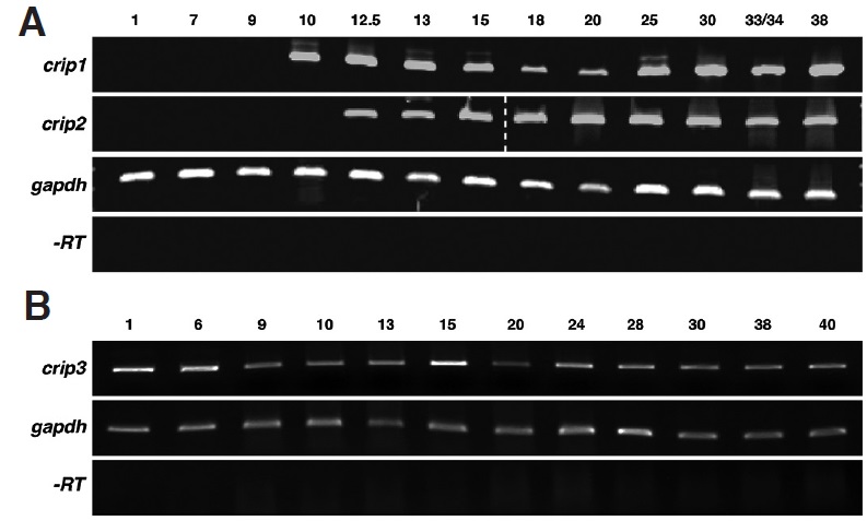 Fig. 3. Temporal expression patterns of crip1-3 during Xenopus laevis embryogenesis analysed by semi-quantitative RT-PCR approaches with cDNA templates of the indicated stages. As loading control gapdh (glycerinaldehyde-3-phosphate dehydrogenase) and as negative controls âRT (reverse transcriptase) reactions lacking the enzyme reverse transcriptase were used. (A) Crip1 and crip2 expression were first detected during gastrulation at stage 10 and 12.5 respectively and continuously expressed till stage 38. (B) In contrast crip3 transcripts were maternally supplied and continuously expressed till stage 40.