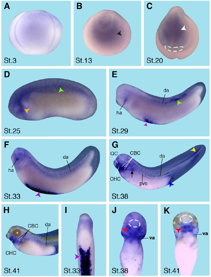 Fig. 4. Crip1 spatial expression pattern during X. laevis embryogenesis. Embryonic stages are indicated in each panel. The white dashed circles depict the cement gland. (A) At stage 3, embryos were negative for crip1 expression (lateral view). (B) Anterior view of a stage 13 embryo. Crip1 was expressed in the anterior neural plate (black arrowhead). (C) The anterior view of a stage 20 embryo shows crip1 expression of in the anterior neural tissue (white arrowhead). (D-H) Lateral views with anterior to the left. (I-K) Ventral views with anterior to the top. (D) At stage 25 crip1 transcripts were detected in the migrating cranial neural crest cells (orange arrowhead) and at the dorsal side of the embryo (green arrowhead). (E-F, I) Crip1 was expressed in the hyoid arch (ha), in the dorsal aorta (da) with a stronger expression in the posterior part (green arrowhead) and in the ventral blood islands (violet arrowhead). (G-H) In later stages crip1 transcripts were strongly detected in the head mesenchyme, namely the quadrate cartilage (QC), ceratobranchial cartilage (CBC), and ceratohyal cartilage (CHC) as well as. Crip1 transcripts were in the dorsal aorta (da) detected. Furthermore, crip1 was expressed in the pronephric tubule convolute (black arrow) and in the posterior cardinal vein (pcv). The stomadeum including the region where the cloaca will form (blue arrowhead) as well as the tip of the tail (yellow arrowhead) showed a strong crip1 expression, too. (J-K) Also the second heart field (red arrowhead) and ventral aorta (va) were positive for crip1.