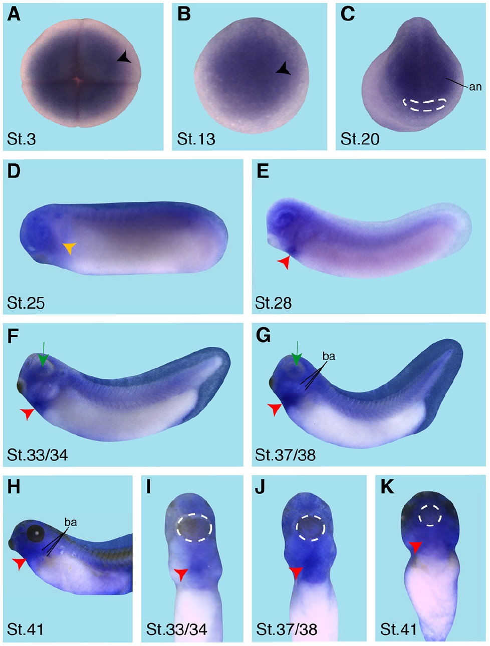 Fig. 8. Spatial expression of crip3 during X. laevis embryogenesis. Embryonic stages are indicated in each panel. The white dashed circles depict the cement gland. (A) Animal view. Crip3 expression was detected at the animal half at 4-cell stage (black arrowhead). (B) Crip3 is expressed in the anterior neural plate. (C) The anterior view of a stage 20 embryo showed crip3 expression in the anterior neural tissue (an). (D-H) Lateral views with anterior to the left. (I-K) Ventral views with anterior to the top. (D-H) At stage 25 and 29 crip3 was expressed in the migrating neural crest cells (orange arrowhead in (D,E) and at later stages in the branchial arches (ba, G,H). (F,G) During organogenesis a very weak crip3 signal was seen in the dorsal side of the embryo (green arrowheads). (E-K) Furthermore, during Xenopus embryogenesis crip3 was detected in the developing eye (green arrow) and cardiac tissue (red arrowheads).