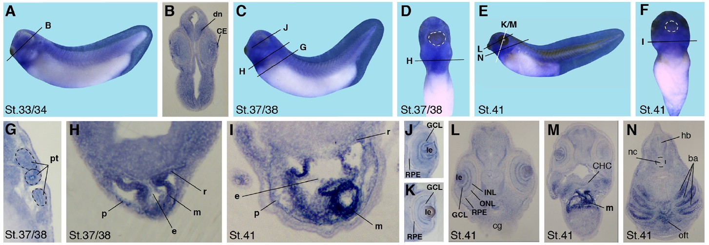 9. Tissue specific expression of crip3 in Xenopus embryos stage 33/34, 38 and 41. (A,C,E) Lateral views with anterior to the left. (D,F) Ventral views with anterior to the top. White dotted circles depict the cement gland. (B, G-N) Transversal vibratome sections through different regions of the embryos with the dorsal to the top as indicated by the lines shown in A,C-F. The pronephric tubules (pt) and notochord (nc) are depicted by dashed circles, respectively (G,N). (B,G) Crip3 transcripts were weakly expressed in the differentiated neurons (dn, B) and in the pronephric tubules (pt, G). (H-I,M-N) The strongest expression of crip3 was found in the developing heart, namely the outflow tract (oft), the peri- and myocardium (p, m) as well as in the pericardial roof (r) and endocardium (e). (B,J-L) Sections through the eye showed a weak crip3 expression in the cornea epithelium (CE) at stage 33/34 (B) and in the ganglion cell layer (GCL) and lens (le) at stage 37/38 and 41, while the inner and outer nuclear layers (INL, ONL) and the retinal pigmented epithelium (RPE) were negative for crip3 (J-L). (M-N) At stage 41 crip3 was expressed in the ceratohyal cartilage (CHC) and the branchial arches (ba). cg cement gland, hb hindbrain.