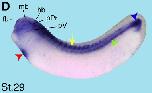 crip3 (cysteine-rich protein 3) gene expression in Xenopus laevis embryo, assayed via in situ hybridization, NF stage 28, lateral view, anterior left, dorsal up.