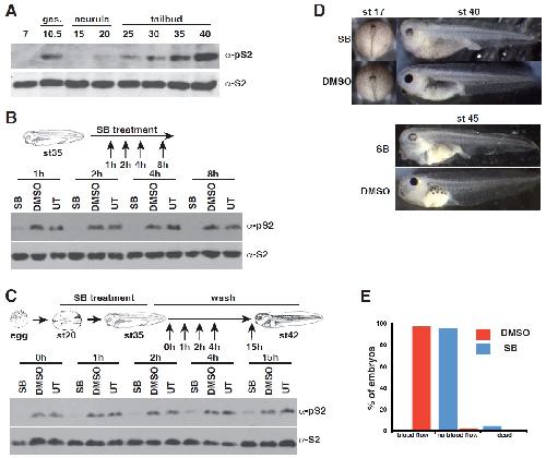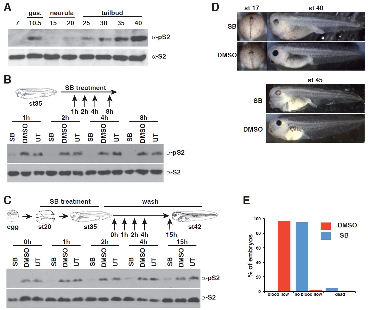 Fig. 1. The second wave of TGFb signalling is necessary for establishing blood circulation in Xenopus embryos. (A) Temporal time course of TGFb activity during early Xenopus development. Total protein extracts from embryos at the indicated stages were analysed by Western blot. Activated Smad2 was detected using anti-phosphorylated Smad2 antibodies (a-pS2, upper panel). The membrane was stripped and reprobed with anti-Smad2 antibodies (a-S2). (B) The small molecule inhibitor SB505124 prevents Smad2 phosphorylation within an hour. Stage NF35 embryos were treated with SB505124 (SB), DMSO (as a control) or untreated (UT) for the indicated amount of time. After protein extraction, the level of Smad2 activity was assayed by Western blotting using antibodies against phosphorylated Smad2 (a-pS2, upper panel). The membrane was stripped and re-probed with anti-Smad2 antibodies (a-S2, lower panel). (C) The SB505124 inhibitor remains active 15h after treatment. Xenopus embryos were treated with the SB505124 inhibitor from stage NF20 to stage NF35 (about 12h for Xenopus tropicalis embryos), washed in 0.01X MMR and collected at the indicated times. After protein extraction, the level of Smad2 activity was assayed by Western blotting using antibodies against phosphorylated Smad2 (a-pS2, upper panel). The membrane was stripped and reprobed with anti-Smad2 antibodies (a-S2, lower panel). In all cases, the experiments were done at least three times and a representative blot is shown. (D) Overall phenotype of SB treated embryos. Embryos were treated with SB505124 (SB) or DMSO (as a negative control) from stage NF15 until stage NF35 and then raised in 0.01X MMR. Pictures were taken at the indicated stages. (E) Effect of the SB505124 treatment on blood flow. Embryos treated with the SB505124 inhibitor (SB, blue bar, n=95) or DMSO (as a negative control, red bar, n=105) were scored at stage 45 for the presence of blood cell circulation in the tail. The graph shows the compounded results of four independent experiments.