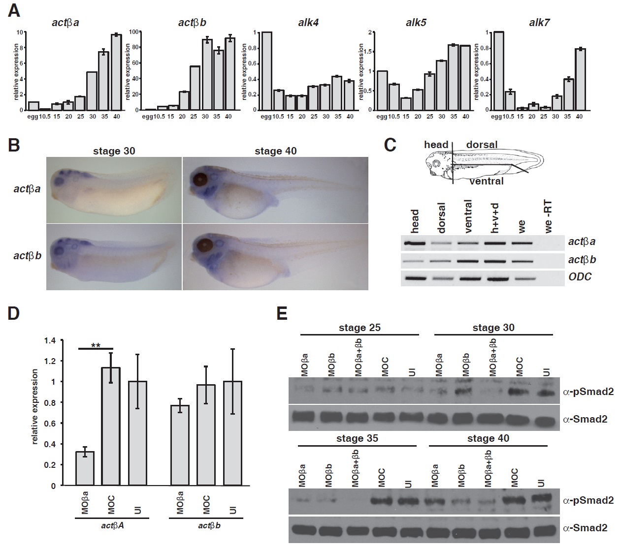 Fig. 2. Activinba and Activinbb are responsible for the second wave of Smad2 phosphorylation. (A) Total RNA from embryos at the indicated stages was isolated, reverse transcribed and subjected to real time qPCR for the indicated genes. The graphs show the mean and standard error of three independent experiments with the expression of each gene normalised to 1 at egg stage. (B) Spatial expression of activin genes. In situ hybridisation of stage NF30 and NF40 Xenopus embryos using probes specific for actba and actbb. (C) Activin ligands are also expressed in the ventral side of a tadpole. Stage NF35 embryos were dissected as indicated and RT-PCR perfomed using primers specific for actba, actbb and odc as a loading control. h+v+d is a reconstituted sample from dissected head, ventral and dorsal parts of the embryo, we is whole embryo. (D) Efficacy and specificity of the morpholino against actba. Xenopus tropicalis embryos were injected at the one-cell stage with 17ng of morpholino against actba (MOba), 17ng of morpholino control (MOC) or uninjected (UI) and raised until stage NF35. After extraction of total RNA and reverse transcription, the samples were subjected to real time qPCR using oligonucleotides specific for the indicated gene. The graph shows the mean and standard error of 4 independent experiments (** p<0.01). (E) Knock down of Actba and Actbb expression causes a reduction of phosphorylated Smad2. Embryos were injected with 17 ng of Actba (MOba) morpholino, 17 ng Actbb morpholino (MObb), 10 ng of each (MOba+bb), 20 ng of MO control (MOC) or uninjected (UI). Embryos were collected at the indicated stage and the amount of phosphorylated Smad2 (a-pSmad2) assayed by Western