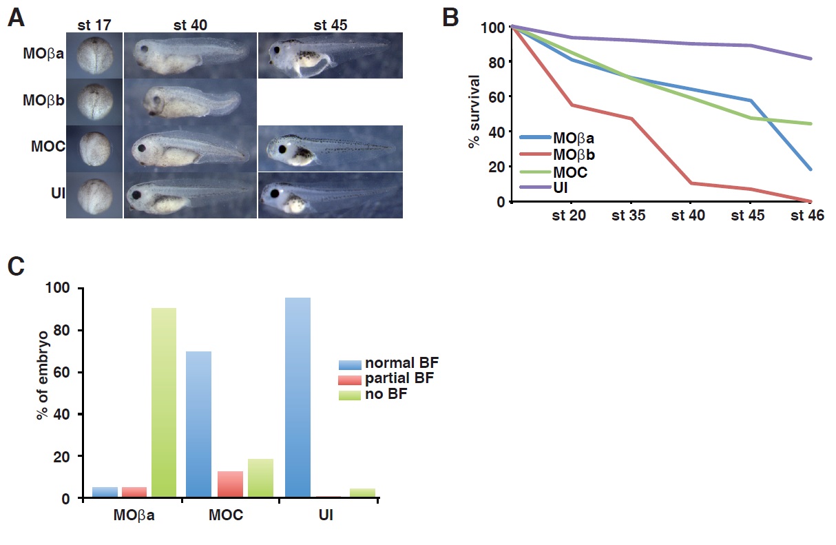 Fig. 3. Phenotype of Activinba and Activinbb morphants (A) Overall phenotype of Actba and Actbb morphants. Embryos injected at the 1-cell stage with 17 ng of MOba, 17 ng of MObb or 17ng of MOC as a control. Pictures of typical embryos were taken at the indicated stages. (B) Survival rate of embryos morphants for Actba and Actbb. Embryos injected as in (A) were scored for survival. The graph show the compounded result of three independent experiments, n=184 embryos for MOba, 151 for MObb, 182 for MOC and 135 for UI. (C) Activin morphants do not have blood flow. Embryos were injected at the one-cell stage with the indicated morpholinos as in (A) and scored at stage NF40 for the presence of blood flow. The graph shows the compounded result of three independent experiments, n=109 for MO Actba (MOba), 19 for MO Actbb (MObb), 100 for MO Control (MOC) and 53 for uninjected (UI).