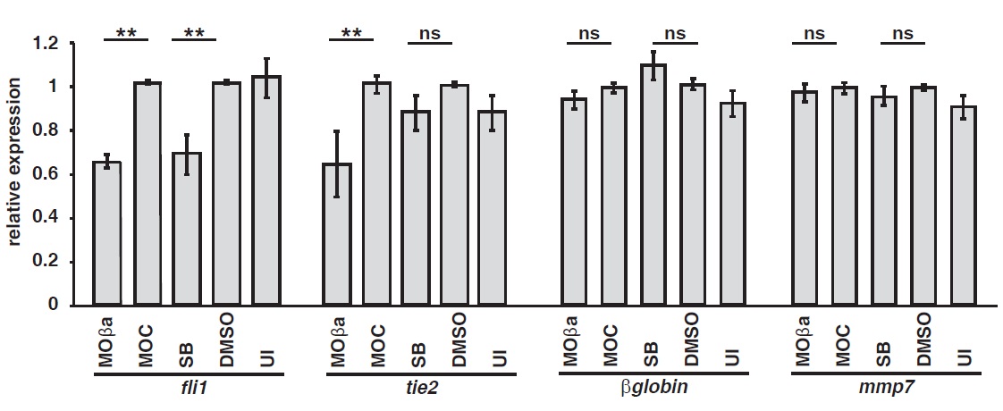 Fig. 4. TGFb signalling is necessary for expression of endothelial cell markers. Embryos were injected at the one-cell stage with MOActba (MOba) and a MO control (MOC) or treated at stage NF15 with 100mM of SB505124 (SB) and DMSO (as a negative control). At stage NF35, the embryos were harvested and total RNA isolated. Real time qPCR was then performed using specific primers for the indicated genes. Fli1 and tie2 are endothelial markers, bglobin is a red blood cell marker and mmp7 is expressed in myeloid cells. The graph represents the mean and standard error of three independent experiments. ns, non specific. ** p<0.01.