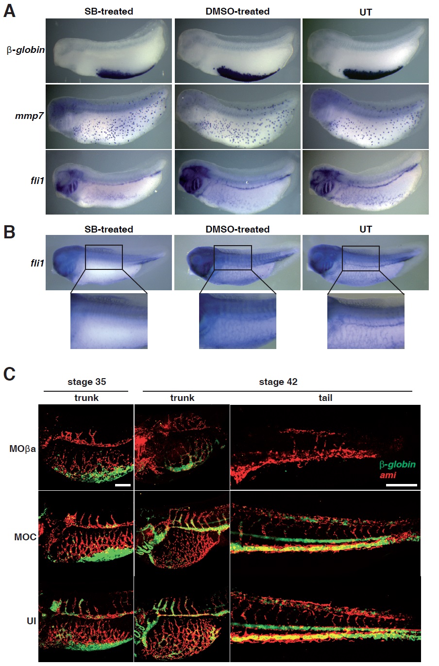 Fig. 5. Inhibition of TGFb signalling affects endothelial gene expression. (A) In situ hybridisation of stage NF30 embryos treated with the SB505124 inhibitor (SB-treated), DMSO (as a control) or untreated (UT) from stage NF15. b-globin is a marker for red blood cells, mmp7 is a primitive myeloid marker and fli1 labels endothelial cells. (B) Embryos were treated as in (A) but until stage NF35 and subjected for in situ hybridisation using a probe against fli1. The lower panels show a magnification of the black box. (C) Actba morphant have a disrupted vasculature. Embryos injected with the indicated morpholinos were fixed at stage NF35 or NF42 and then processed for fluorescent in situ hybridisation using antisense probes against b-globin (a red blood cell marker, green) and ami (an endothelial cell marker, red). The samples were imaged using confocal microscopy and a maximal projection is shown. In all cases, anterior is left, dorsal up. The scale bar represents 200 mm.