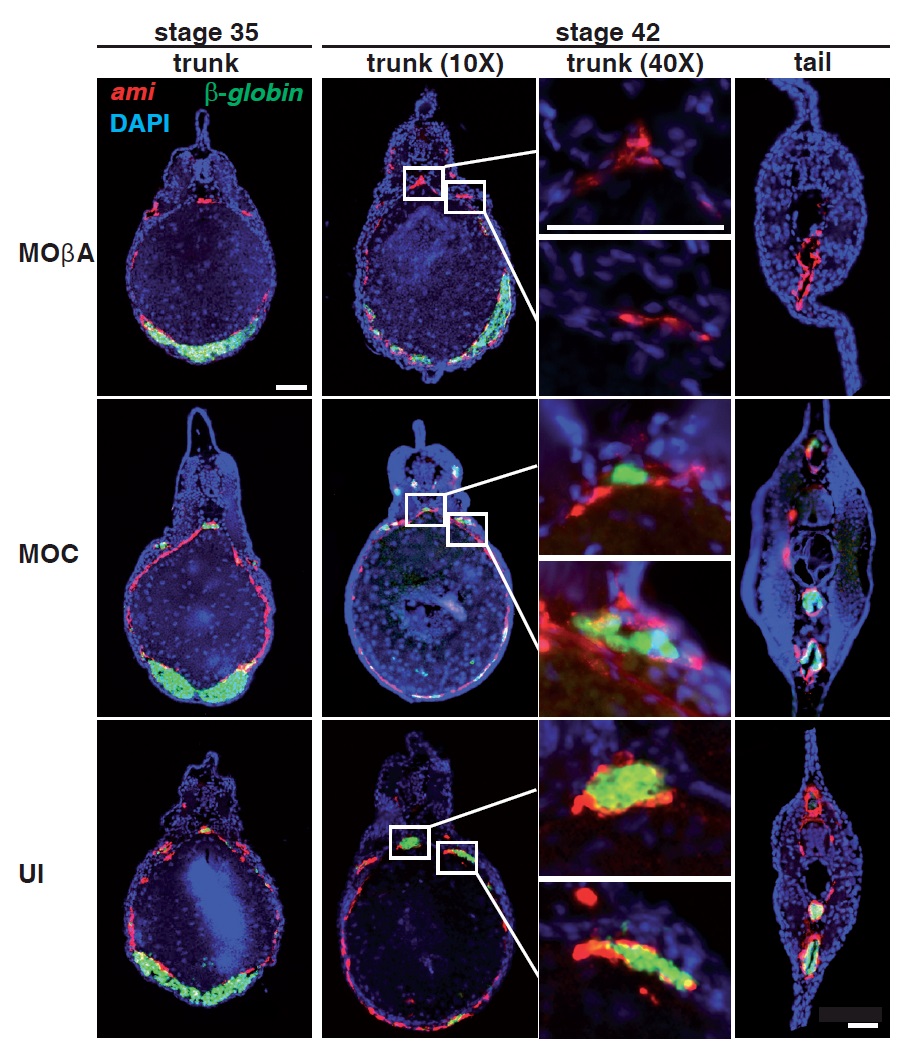 Fig. 6. The organisation of endothelial cells in disrupted in Actba morphants. Embryos injected with the indicated morpholinos were fixed at stage NF35 or NF42 and then processed for fluorescent in situ hybridisation using antisense probes against b-globin (a red blood cell marker, green) and ami (an endothelial cell marker, red). After embedding and cryosection, the sections were stained for DAPI (blue) to label the nuclei. The sections are at the level of the trunk and the tail. The white boxes show a close up of the dorsal aorta (DA) and the posterior cardinal vein (PCV). Dorsal is up and the scale bar represents 50mm.