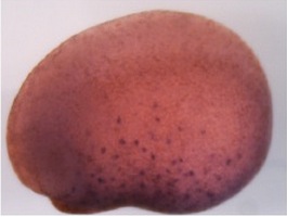 zfp36 (ZFP36 ring finger protein) gene expression in Xenopus tropicalis embryo, assayed via in situ hybridization, NF stage 32, lateral view, anteriorleft, dorsal up