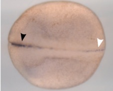 zfp36 (ZFP36 ring finger protein) gene expression in Xenopus tropicalis embryo, assayed via in situ hybridization, NF stage 18, dorsal view, anteriorleft.