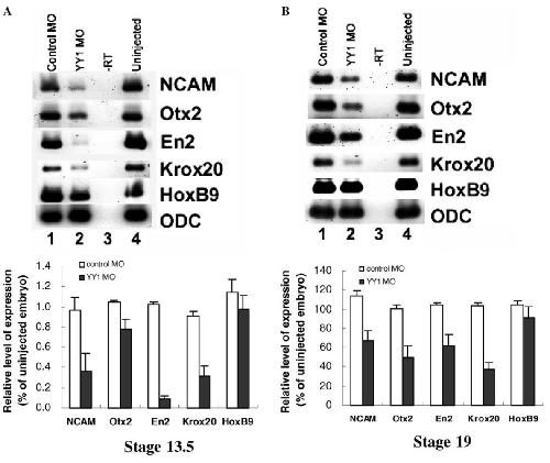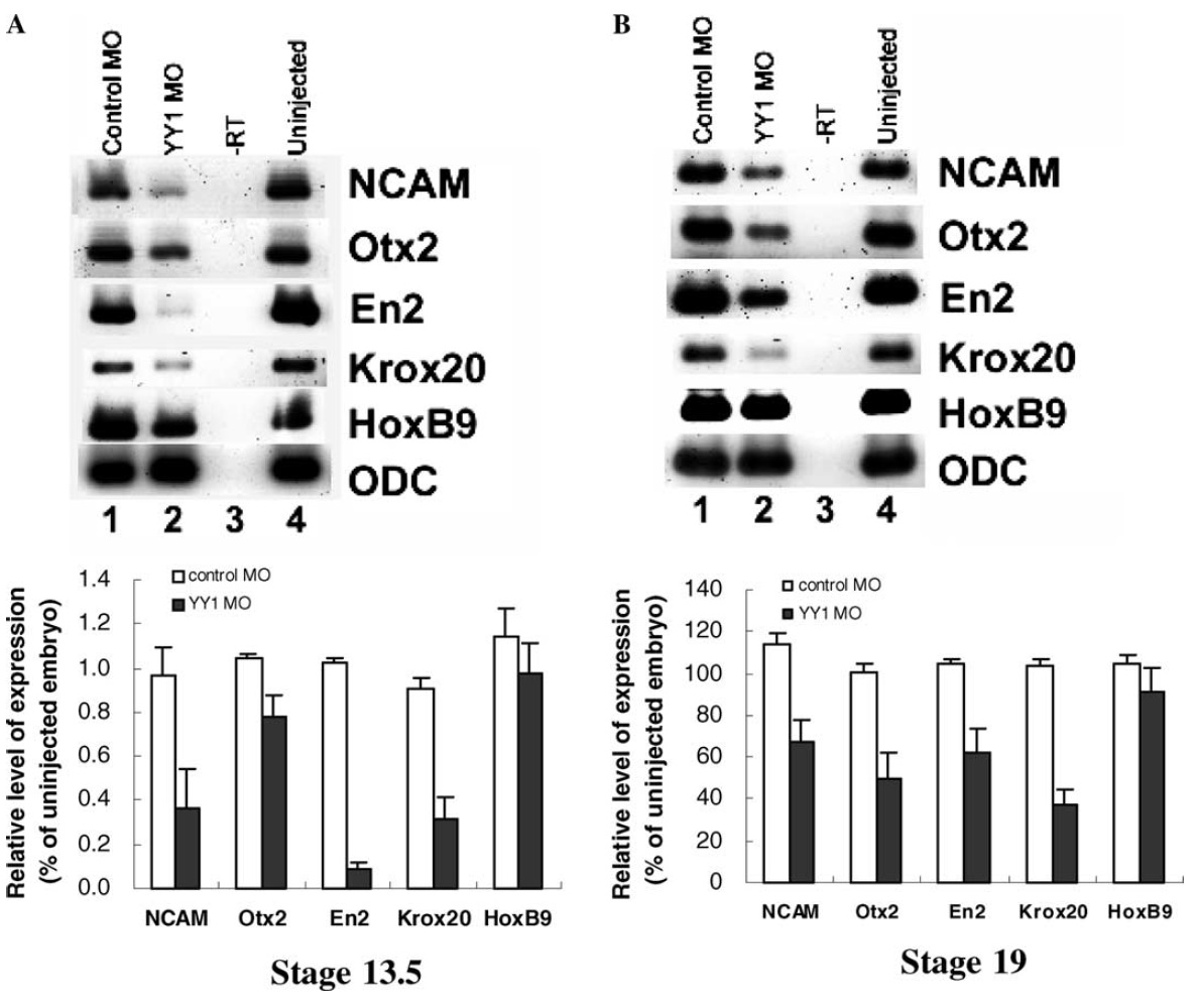 embryos (lane 2), and uninjected embryos (lane 4) by quantitative RT-PCR assay at stage 13.5 (A) and stage 19 (B). XYY1 MO was injected into both