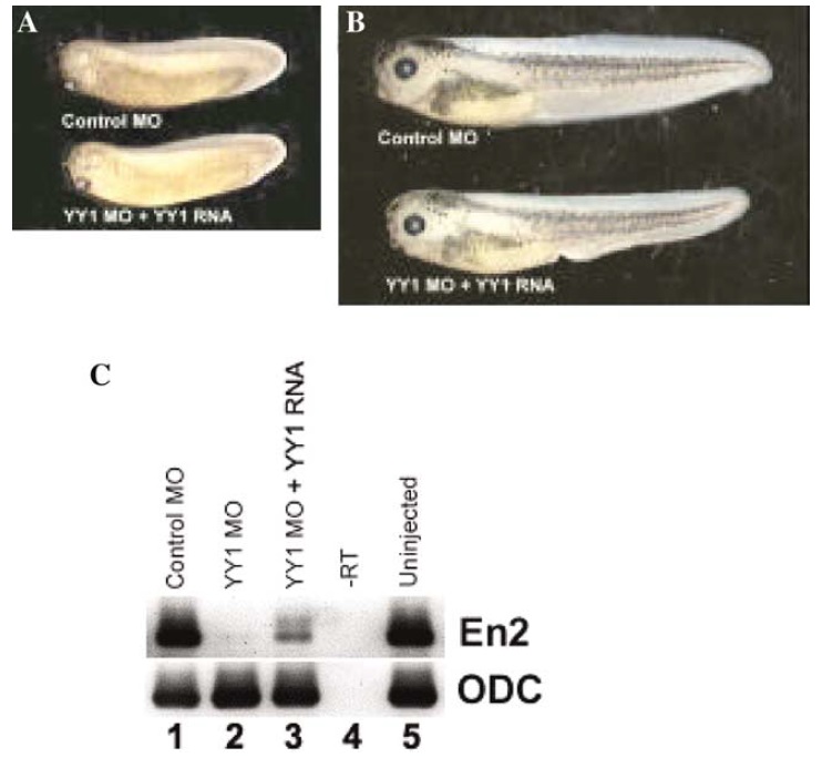 Polycomb group (PcG) genes are required for the stable repression of the homeotic genes and other developmentally regulated genes. Yin Yang 1 (YY1), a vertebrate homolog of the Drosophila PcG pleiohomeotic (Pho), is a multifunctional protein that can act as a repressor or activator of transcription. Xenopus YY1 (XYY1) protein was localized in the central nervous system (CNS), particularly anterior neural tube of tailbud stage embryos. To elucidate the role of endogenous XYY1, loss-of-function studies were performed using XYY1 antisense morpholino oligonucleotide (XYY1 MO). Inhibition of XYY1 function resulted in embryos with antero-posterior axial patterning defects and reduction of head structures. XYY1 MO also reduced the expression of En2, a midbrain/hindbrain junction marker, which was rescued by co-injection of XYY1 mRNA. However, XYY1 MO-injection did not affect the expression of HoxB9, a spinal cord marker. These results suggest that YY1 controls antero-posterior patterning of the CNS during Xenopus embryonic development.