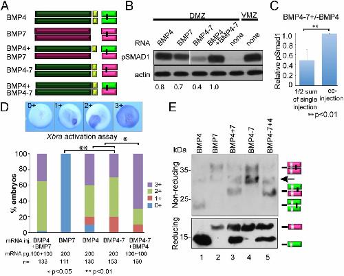 Fig. 4. The prodomain of BMP4 is necessary and sufficient to generate stable heterodimers with enhanced activity. (A) Schematic illustration of ligands generated from native and chimeric BMP precursor proteins. (B) BMP RNAs were injected individually (200 pg) or together (100 pg of each RNA) near the dorsal midline of four-cell embryos. DMZ and VMZ explants were isolated at stage 10 and pSMAD1 levels were analyzed by immunoblot. Actin levels were analyzed in duplicate samples as a loading control. The relative level of pSMAD1 induced by injection of BMP4-7 or BMP4 alone, normalized to actin and reported as a fraction of that induced by the two co-injected RNAs, is indicated below each lane. All lanes are from the same pSmad1 immunoblot, aligned following removal of an intervening lane (following the 2nd lane, marked by white bar) using Photoshop. The pSmad1 data shown in Figs. 2B (Lower Right), 3B, and 4B is all from a single injection experiment, run on the same gel and thus the BMP4 and BMP7 control lanes are the same in all three blots. Actin loading controls for these lanes are from duplicate samples that were rerun on different gels. (C) Normalized pSMAD1 levels in embryos injected with BMP4â7 or BMP4 alone were added together, divided by two, and reported as a fraction of pSMAD1 levels induced by the two coinjected RNAs. Data are from three independent experiments (mean ± SD). (D) BMP RNAs were injected along with β-galactosidase RNA into one animal pole blastomere of 8- to 16-cell embryos. Embryos were stained for β-galactosidase activity at stage 11 and then assayed for expression of Xbra by in situ hybridization. The spread of Xbra signal outside of cells that express the precursor proteins was scored as 0+ to 3+ as illustrated. A total of 30â50 embryos were injected with each RNA per experiment and results are pooled from a minimum of three experiments. (E) Protein present in blastocele fluid from the same number of embryos in each group was deglycosylated, resolved by SDS/PAGE under reducing or nonreducing conditions as indicated, and immunoblots were probed with antibodies specific for the myc epitope in the ligand domain. Bands corresponding to each ligand dimer or monomer are indicated to the right of each gel. The arrow marks a nonspecific band due to cross-reaction of the myc antibody with PNGase. |