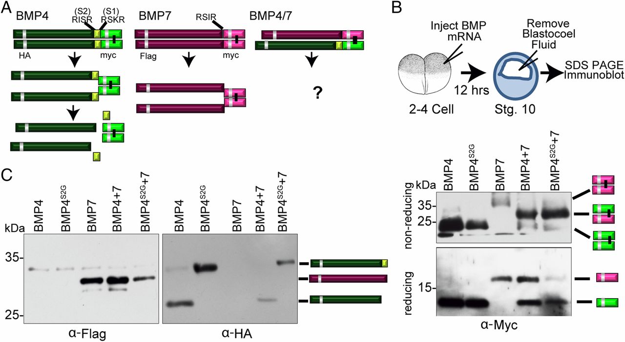 Fig. 1. The S1 and S2 site of BMP4 is cleaved in BMP4/7 heterodimers. (A) Schematic illustration of cleavage patterns of BMP4 and BMP7 homodimers and position of epitope tags. (B and C) Two-cell embryos were injected with RNA encoding BMP4 (500 pg), BMP4S2G (1,000 pg), BMP7 (500 pg), or BMP4 and BMP7 (250 pg each). Blastocele fluid was extracted from the same number of embryos in each experimental group at the gastrula stage and proteins were deglycosylated and resolved by SDS PAGE. Immunoblots were probed with antibodies specific for myc (B), Flag, or HA epitopes (C) as indicated below each gel. Bands corresponding to ligand dimers, or to ligand or prodomain monomers, are indicated to the right of each gel. |