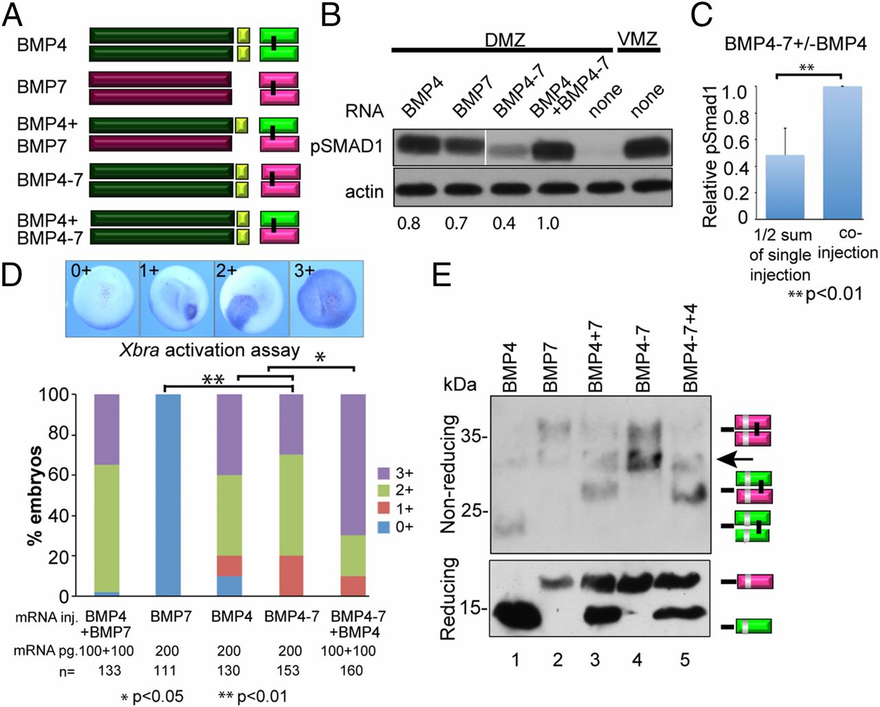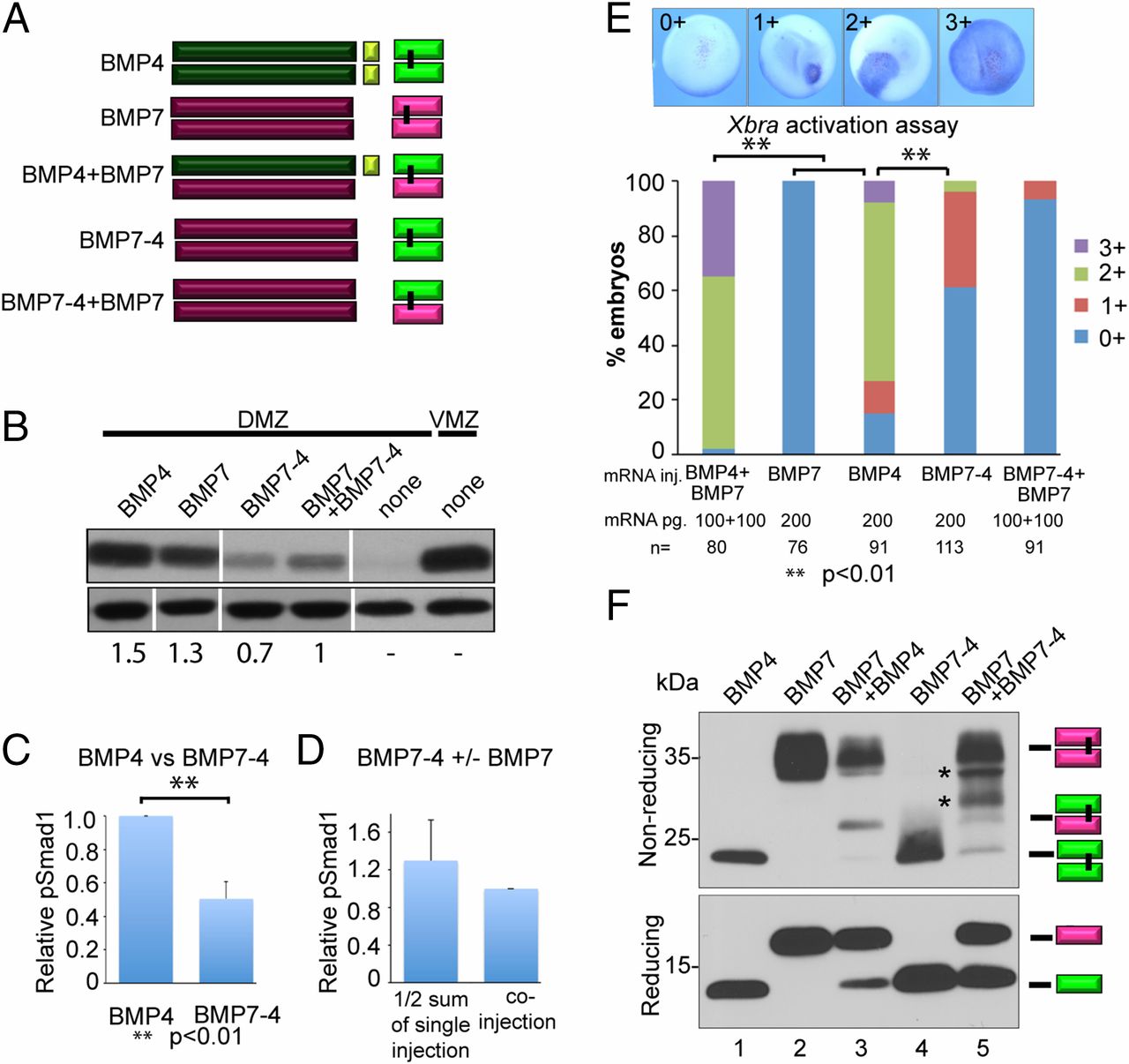 The prodomain of BMP4 is necessary and sufficient to generate stable BMP4/7 heterodimers with enhanced bioactivity in vivo.