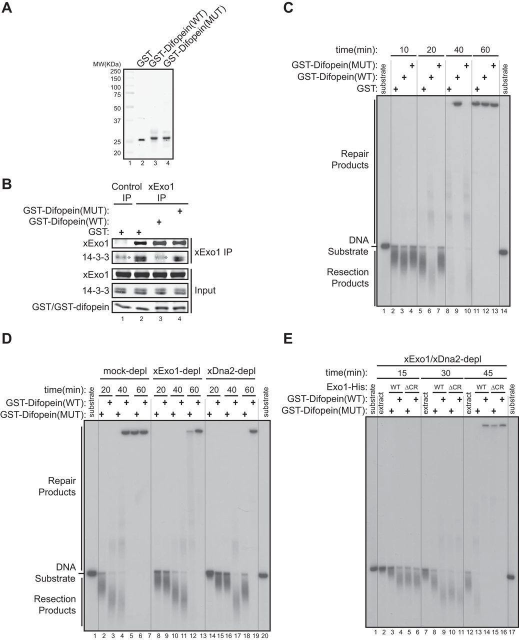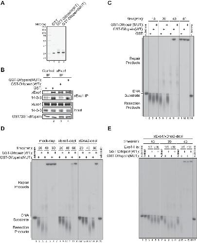 14-3-3 proteins repress Exo1-mediated DNA end resection in a Xenopus egg extract. A, purified recombinant GST, GST-Difopein(WT), and GST-Difopein(MUT) were expressed in and purified from BL21(DE3) E. coli cells. MW, molecular weight. B, effects of GST, GST-Difopein(WT), or GST-Difopein(MUT) on the association of xExo1 with 14-3-3 proteins in the Xenopus NPE. The asterisk denotes a nonspecific band detected by the anti-14-3-3 antibody. IP, immunoprecipitation. C, effects of GST, GST-Difopein(WT) or GST-Difopein(MUT) on DNA end resection in the extract. Vertical lines were added for sample lane identification. D, effects of GST-Difopein(WT) or GST-Difopein(MUT) on DNA end resection in the mock-depleted (depl) and xExo1-depleted or xDna2-depleted extracts. Vertical lines were added for sample lane identification. E, effects of GST-Difopein(WT) or GST-Difopein(MUT) on DNA end resection mediated by added Exo1(WT)-His or Exo1(ΔCR)-His in the extract depleted of both xExo1 and xDna2. Vertical lines were added for sample lane identification.