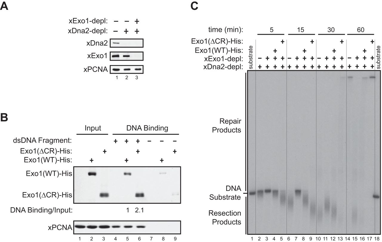 The central region of Exo1 limits DNA end resection activity in a Xenopus egg extract. A, immunodepletion (depl) of the Xenopus Dna2 protein (xDna2) or of both xDna2 and xExo1 from the Xenopus NPE. B, physical association of Exo1(WT)-His and Exo1(ΔCR)-His with a bead-immobilized, 2-kb DNA fragment in xExo1-depleted NPE. C, DNA end resection activity toward a 3′ 32P-labeled, 6-kb dsDNA fragment in the Exo1 and Dna2 codepleted NPE depicted in A that was supplemented with Exo1(WT)-His or Exo1(ΔCR)-His. Vertical lines were added for sample lane identification.
